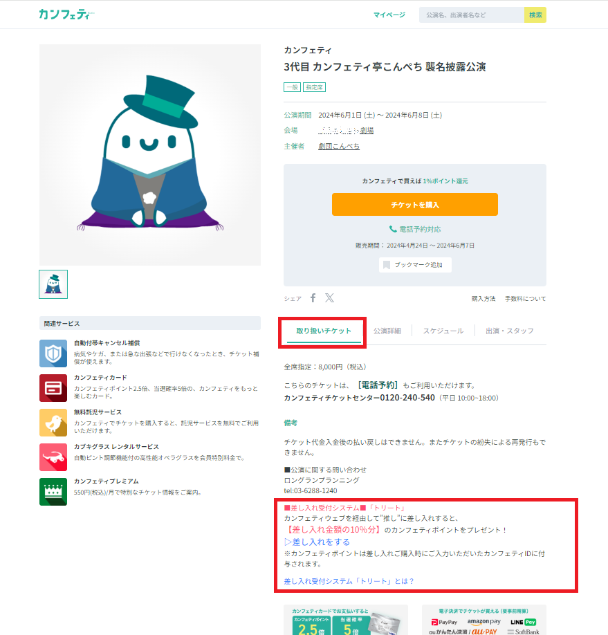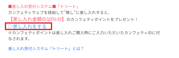 カンフェティウェブを経由して”推し”に差し入れすると、 【差し入れ金額の10%分】のカンフェティポイントをプレゼント!ぜひご利用ください。
